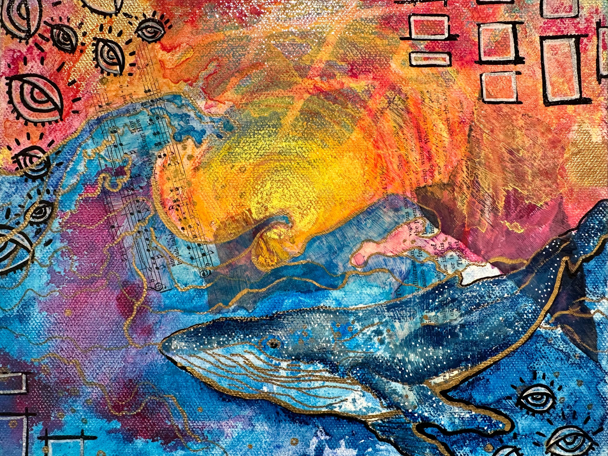 A sunrise ignites the sky in a cascade of vibrant hues, illuminating the vast, fluid motion of a whale gliding through an ocean alive with energy and color. The graffiti elements on the sides pulse with urban expression, blending street art’s raw spontaneity with the fluidity of water and sky, while oil paint and mixed media create layers of depth and texture. Painting this felt like riding a current of pure creative freedom—where the wild meets the expressive, where movement and light collide, and where the ocean’s untamed spirit merges with the rhythm of the streets.