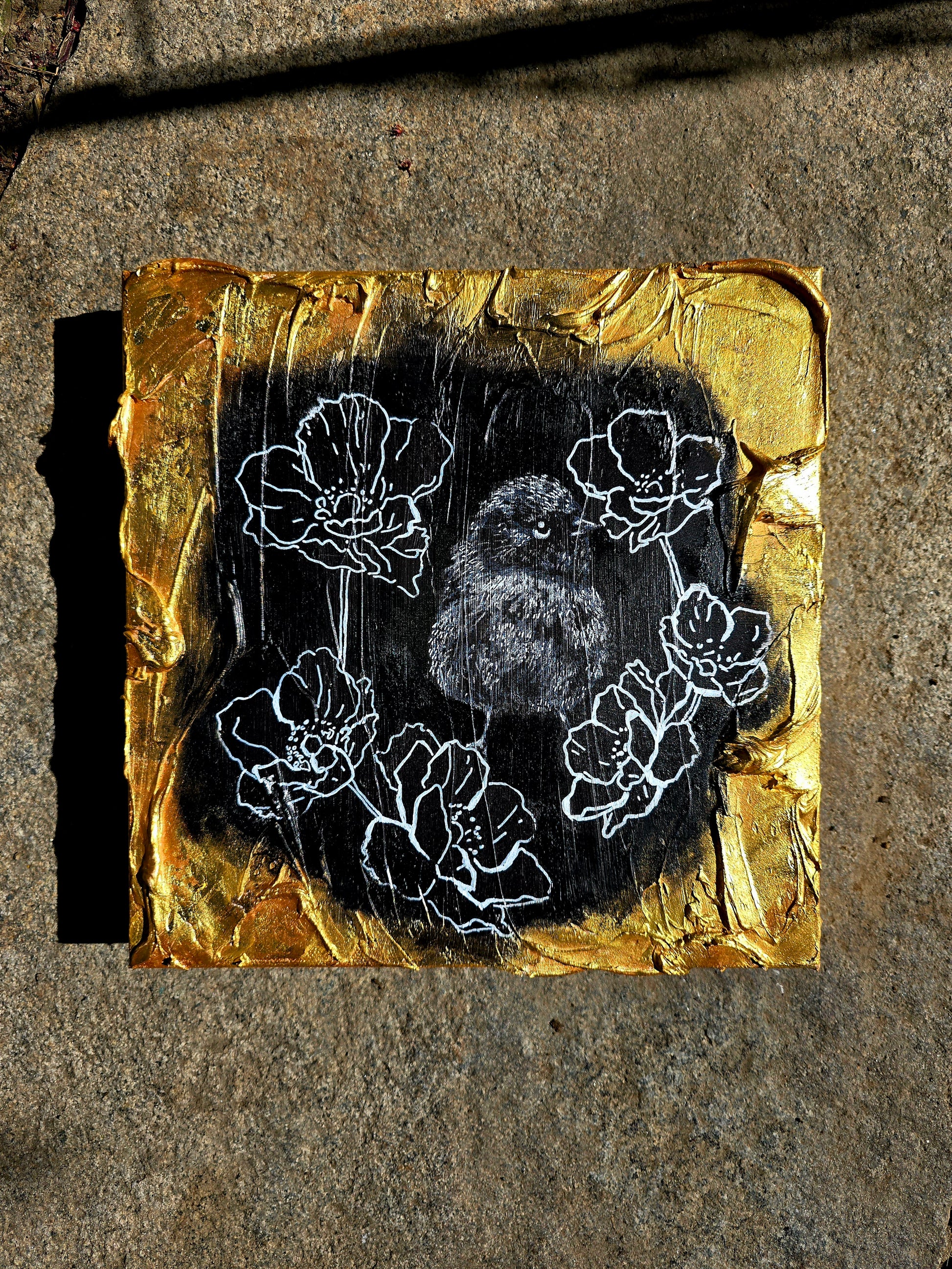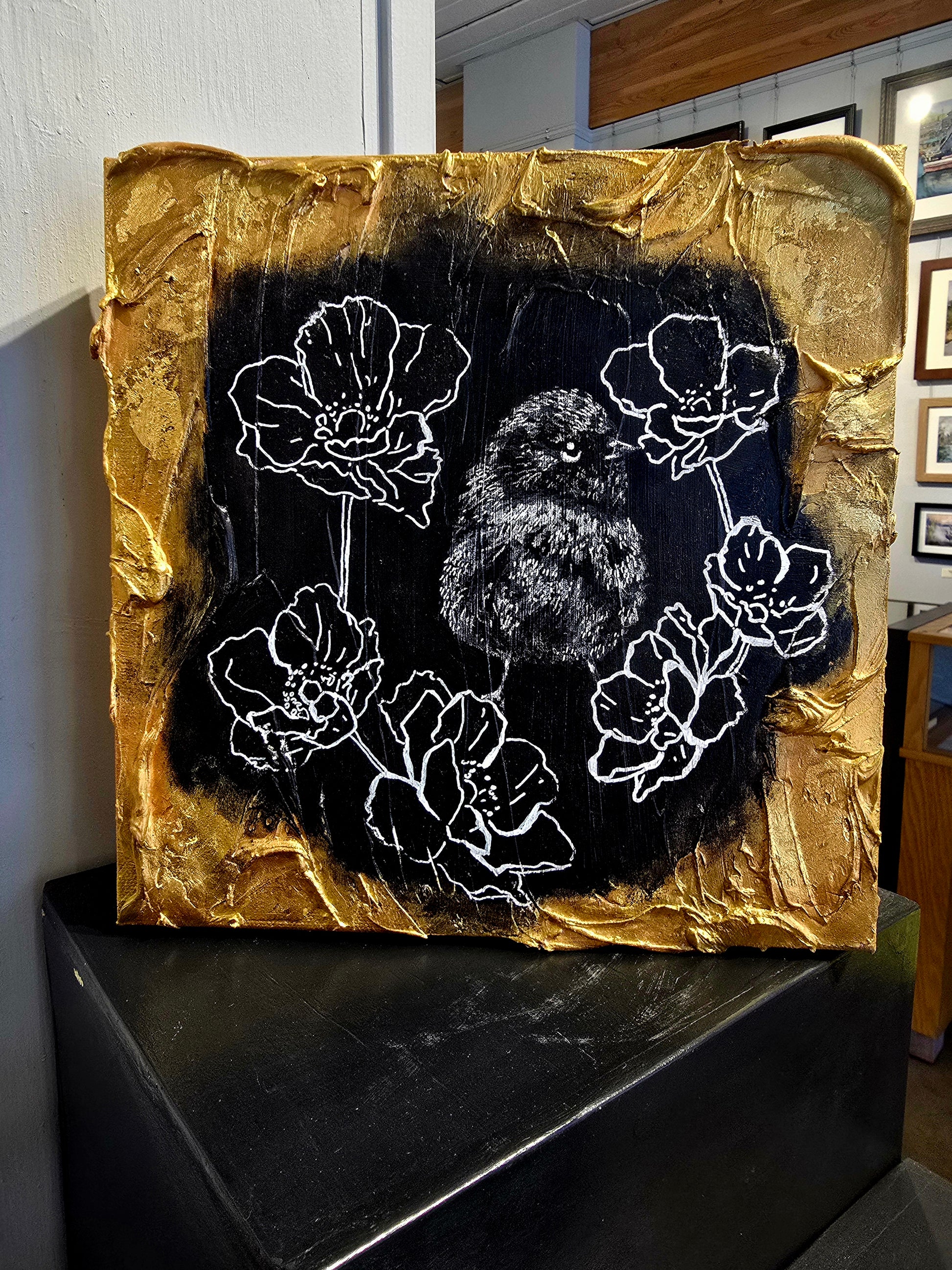"Perched in Bloom" unfolds on a 10"x10" canvas, layered with white charcoal, acrylics, textured spray paint, and crowned in luminous 24kt gold. Painting it felt like capturing a spirit resting between earth and sky—soft in form, yet fierce in soul. Every texture and mark became a quiet celebration of resilience, framed by gold that sings of courage blossoming in every breath.
