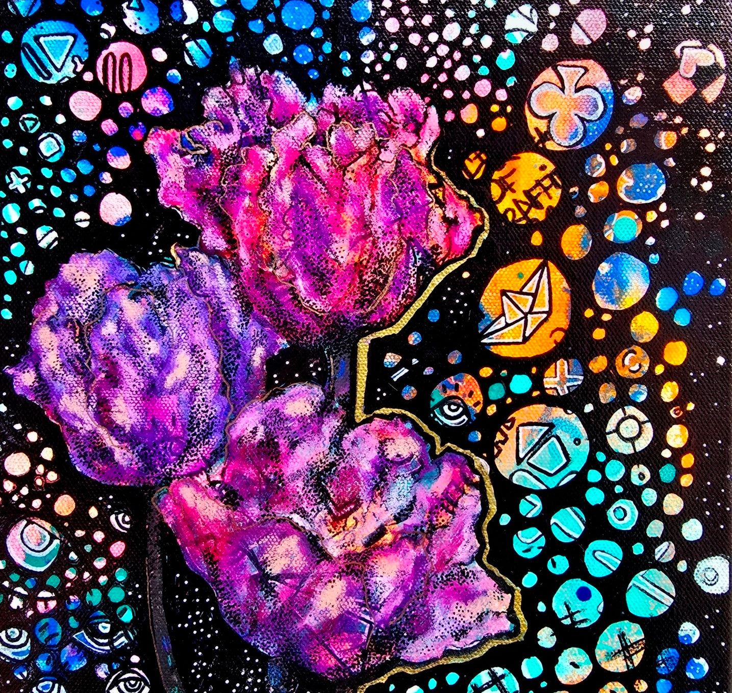 Tulips burst into color, their petals catching the glow of a neon-drenched, graffiti-laced backdrop, where paint drips and textures speak of movement and transformation. The fusion of nature and street culture creates a dynamic energy—florals that don’t just exist but demand to be seen, thriving in the midst of chaos and creation. Painting this felt like a rebellion and a celebration all at once—a reminder that beauty doesn’t conform; it erupts, bold and unapologetic.
